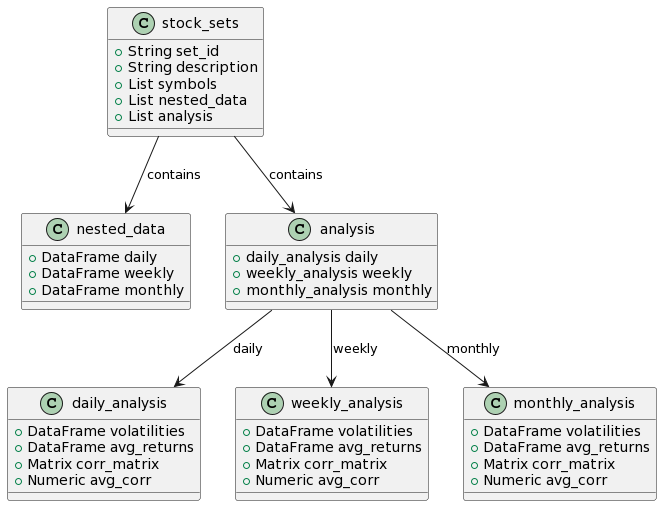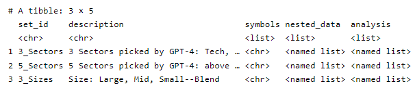analysis: a list column that holds the historical analysis. Its structure mirrors the nested_data. For example, the second item (row) is itself a list of 3 items: daily, weekly, and monthly. Each of this is another list: volatilities and average returns (tibble vectors); correlation matrix, and average correlation (the off diagonal average correlation as a rough measure of diversification).