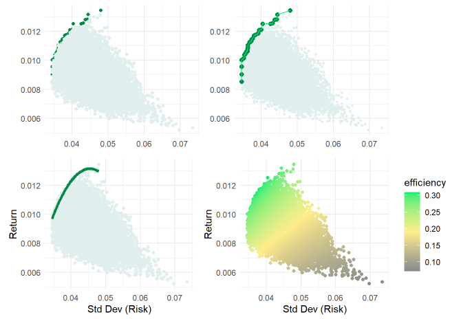 }The simulation outcome is an X,Y pair {risk = standard deviation, return} that is a function of each sector’s return (a linear, weighted function) and the portfolio’s volatility as a function of the historical correlation matrix. The fun part, for me, is visualizing the results. At this early stage, I quickly experimented (see below which correspond to ggplot objects p1 to p4 in my code) with (i) a different color for the efficient points, (ii) drawing a line that connects the slightly larger efficient points, (iii) a polynomial regression line fitted to the efficient points, and (iv) a gradient scale based on a temporary Sharpe ratio.