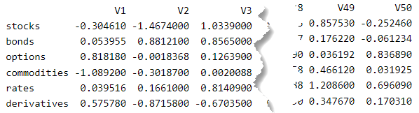 For step 2, see code (the only issue is file size). Step 3 is just a lookup (of words in my vectors) into the GloVe dataset. This yields a matrix where each row is a word (e.g., “stocks”) with 50 features (or columns). That’s the essential mutation that underlies the exercise. Each word is represented by 50 dimensions (V1, V2, … , V50) that are themselves abstract: