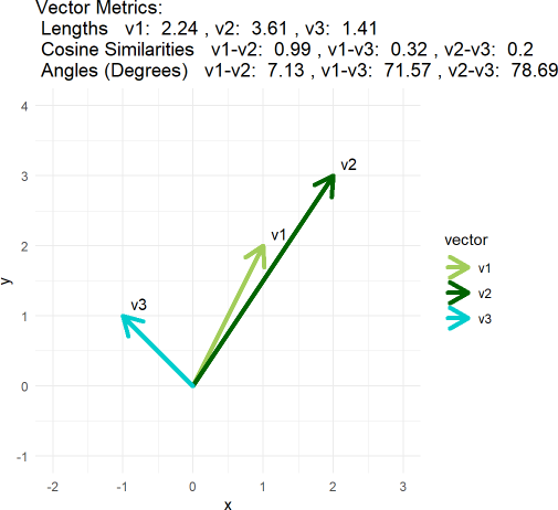 For a glorious video on cosine similarity, see Josh Starmer. Below is my ggplot illustration of the concept with super-short vectors (see the “appendix” to my same code).