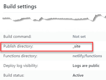 For the one-time Netlify configuration, the key step is to tell Netlify where to find the rendered site. In my case, that's the _site subdirectory. See below.