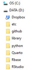 I think it's helpful to get comfortable with the PATH variable. When you run a command in a shell, Windows looks to directories listed in the path variable. Just as Windows has a PATH, R has a path (called a library tree) that we get/set with the .libPaths() function. Per my root-biased structure, I appended my windows PATH to include "D:\python"; and analogously my Rprofile.site contains a line—i.e., .libPaths(c("D:/library", .libPaths()))—that appends the root library to the existing .libPath. When learning R, it’s good to understand the steps in its startup sequence. I won't cover the python installation here; you don't need to install python for Quarto.