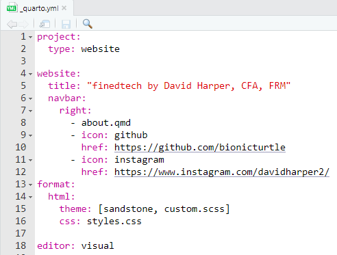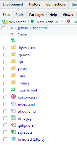 This _quarto.yml config file is located in the root of my local Quarto website at D:\github\fintech2. I love how Posit has streamlined file organization (see below). My root only contains two actual Quarto documents (index.qmd and about.qmd). The finedtech2.Rproj is an Rstudio project file that makes it easy to switch among different projects; i.e., it stores the settings associated with this working directory.