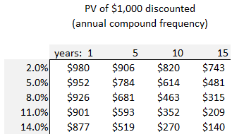 In Excel, we retrieve this value with the formula: =1000/1.08^5. Although it's unnecessary, we can also use a function: -PV(8%, 5, 0,1000) = 680.58. By our estimate, omitting fees and frictions, the lender will give Acme $680.58 today and expect to be repaid $1,000 (the face value) in five years. If we increase the discount rate to 9.0%, the theoretical price (PV) declines: