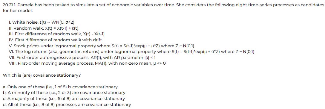 Our time-series reading includes the hard concept of covariance stationary. My question below is super bland, but it tackles the definition with density by asking about eight of the patterns in the readings (something the reading doesn’t do very well, so this Q&A set becomes an efficient cheat sheet).