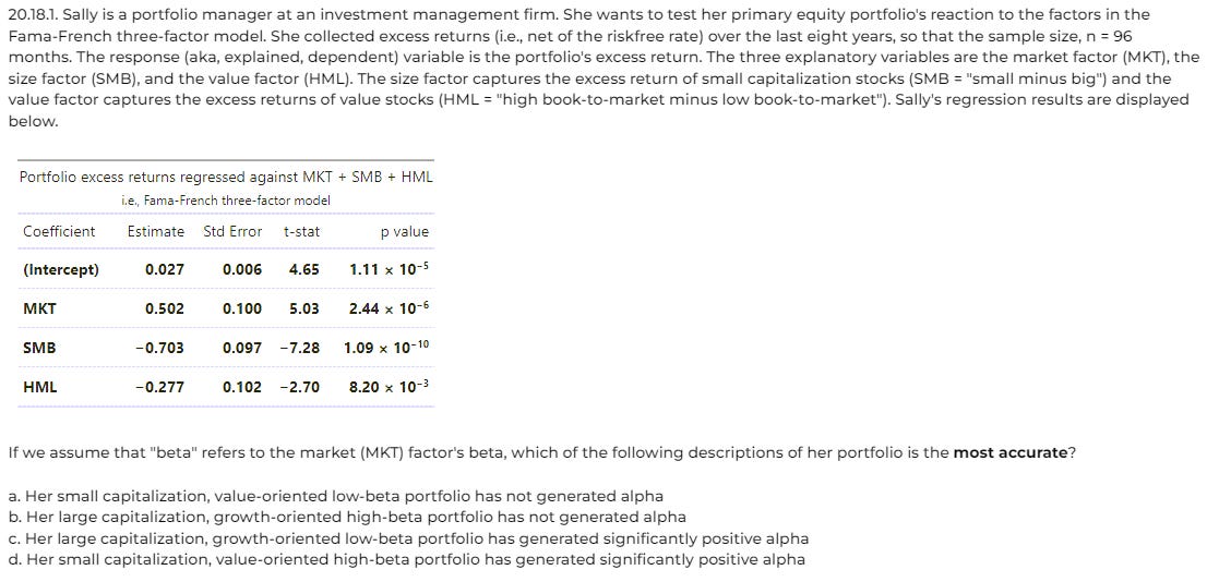 Practice questions (PQs) are either quantitative or qualitative; aka, conceptual. I’m not a fan of heavy word problems that straddle qualitative and quantitative objectives2. Qualitative PQs derive from learning outcome (LO) verbs such as explain, describe, or identify; e.g., “Identify the major risks faced by banks” leads to a set of qualitative PQs. Quantitative PQs derive from LO verbs such as calculate, compute, or apply; e.g., “Apply the GARCH (1,1) model to estimate volatility” must lead to a quantitative question because volatility cannot be understood without calculations3. Verbs like interpret or estimate can prompt either quantitative/conceptual question types. Also, the except for question type is special in the artist's toolkit, to be used when striving for density. A carefully written except for question can teach for months or years! Finally, I tend to parse the Q&A into five elements: Stem, choices [aka, options], key, distractors, solution, and explanation.