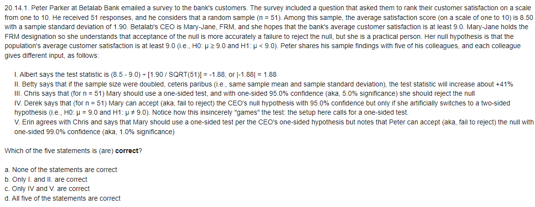 The one-sided hypothesis test is notoriously challenging, so this PQ smoothers the hard idea with density. Each of the “Albert says, Betty says, Chris says” … is based on questions we’ve received on the forum (so we know they are stumbling blocks): customer support questions can be an ideal source for future questions!
