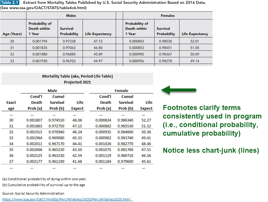 Below is a mortality table by GARP (upper panel) and our version (lower panel). An actuary will know the exact definitions, but for our purposes, we want to clarify by matching these probability concepts with their definitions elsewhere in the program.