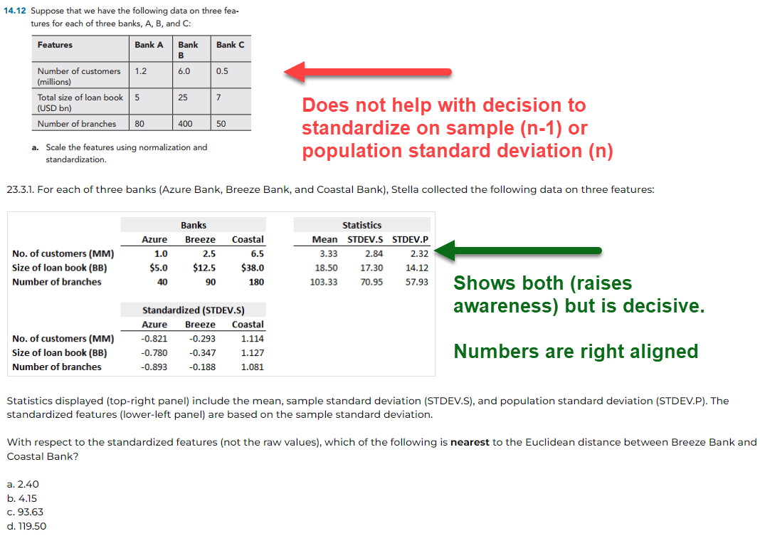 Below is GARP’s setup (top panel) and our analogous setup for a similar question. Rather than ignore the sample/population choice when standardizing, our problem embraces the difference and uses the occasion to surface a small but realistic user choice that arises! It’s tiny but I don’t like their left-aligned numbers because it makes it just a tad harder to compare numbers.