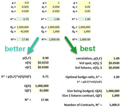 Second, we should edit to reduce clutter. If the question includes a chart, we can often improve a chart by (i) deleting chart-junk or (ii) adding labels for readability. Below are three versions of a setup for the optimal number of hedging contracts. The best version includes text labels (“correlation”) and mathematical symbols, “ρ(S,F)”. This sort of redundancy is helpful.