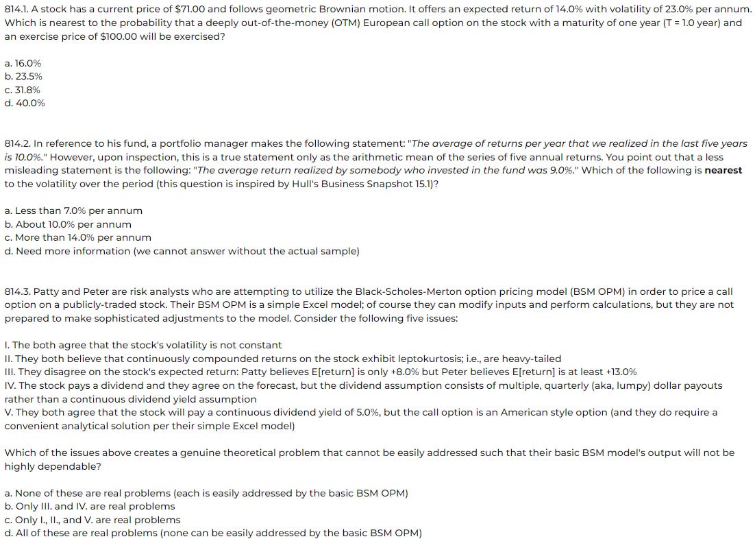 This PQ set is about the Black-Scholes and its lognormal property. There is a mix but each has depth. I’m proud of 814.1 which is short but sweet with plenty of depth potential (as the subsequent thread showed). A mere 63 words supply five numeric assumptions, including redundancy to help with clarity; i.e., “OTM”, “T = 1.0 year”.